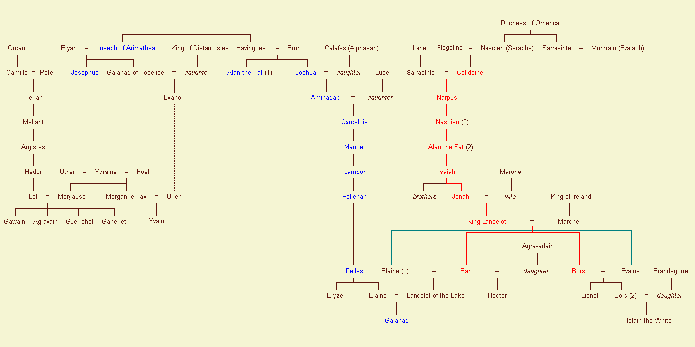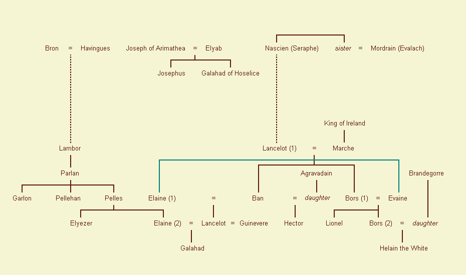 Er dient opgemerkt te worden dat sommige namen tweemaal in de stamboom voorkomen. Er zijn twee Nasciens, twee Alain de Dikke, en twee Lancelots. De held Lancelot van het Meer dient onderscheiden te worden van zijn grootvader, koning Lancelot.