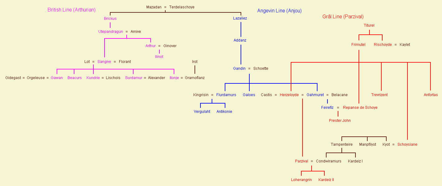 Merk op dat, afgezien van Arthur en Lot, veel namen zijn veranderd. Zo is Perceval veranderd in Parzival, Gawain in Gawan, Guinevere in Ginover, Sangive was Arthurs zuster, enzovoort. Anfortas is de Graalkoning. Zelfs de naam Graal is veranderd in “Gral” of “Gral”.