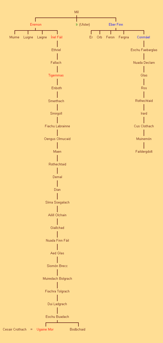 Deze stamboom toont een lijst van koningen die afstammelingen waren van Míl via twee hoofdlijnen, Eremon en Eber Finn, die elk zonen van Míl waren. De vijandschap tussen Eremon en Eber Finn duurde generaties lang na hun dood voort.