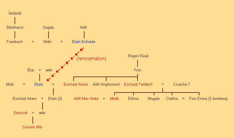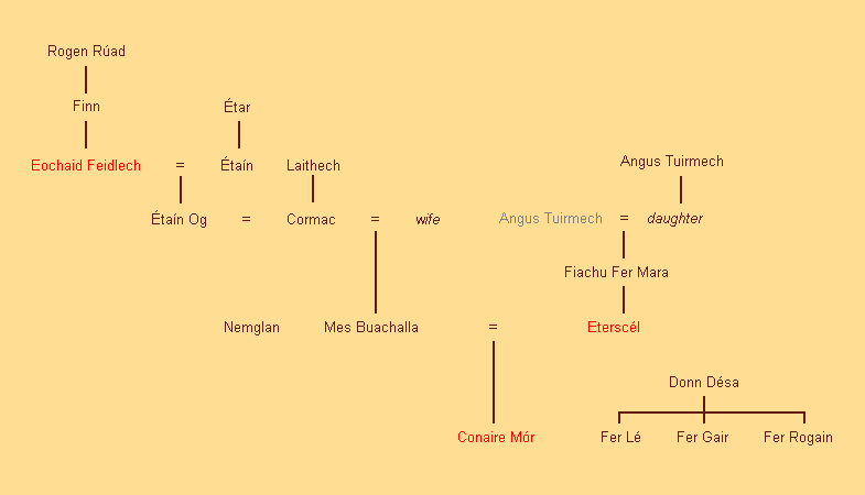Bovenstaande genealogie toont de lijn van Conaire Mor vanaf Etain; mijn bron hiervoor is Tochmarc Étaín, de “Verleiding van Etain”. Zie Verleiding van Etain.