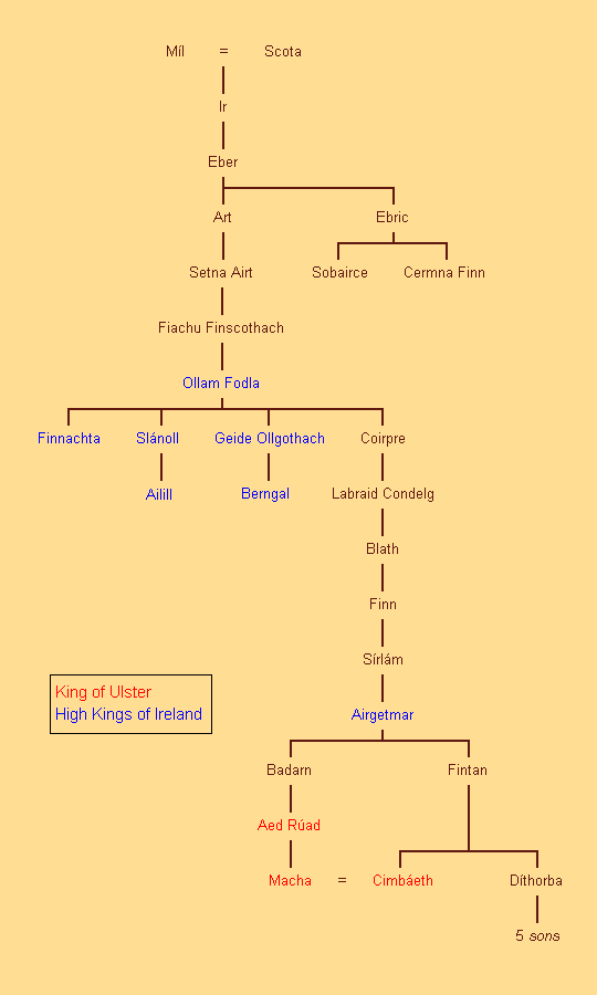 De genealogie op deze pagina bevat de stambomen van de rivaliserende provincies Ulster en Connacht, en van Tara, de zetel van de Hoge Koning.