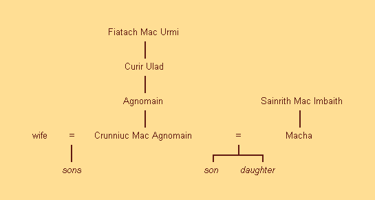 Bovenstaande stamboom toont een alternatief verslag van hoe het heuvelfort Emain Macha zijn naam ontving van een andere vrouw genaamd Macha. Deze tweede Macha was verantwoordelijk voor het uitspreken van een vloek over de mannen van Ulster. Zie de Vloek van Macha.