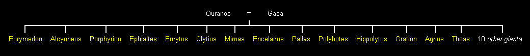 Ik kon de kinderen van Gaea en Ouranos (Uranus), die bekend staan als de Gigantes of Reuzen, niet volledig weergeven in de bovenstaande stamboom, omdat er 24 reuzen waren. Hieronder vindt u daarom een andere stamboom met de meeste Gigantes. De Gigantes werden geboren uit het bloed van Ouranos’ geslachtsdelen die op de aarde (Gaea of Ge) terechtkwamen.