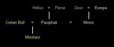 Ik heb niet alle monsters in de eerste stamboom opgenomen, voornamelijk omdat zij niet in de genealogie pasten. Een daarvan is de Minotaurus uit Kreta. De Minotaurus was het nageslacht van de Kretenzische Stier en Pasiphaë, de echtgenote van koning Minos van Kreta. De held Theseus doodde uiteindelijk de Minotaurus. Een meer gedetailleerde stamboom van Europa en Minos vindt u in het Huis van Kreta.