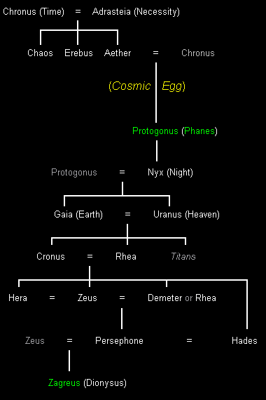 De twee stambomen hieronder zijn gebaseerd op de mythe van de Orphische Schepping, die de grondslag vormde van de Orphische Mysteriën. De twee stambomen zijn gerelateerd aan de Orphische mythe van Protogonus-Zagreus-Dionysus.
