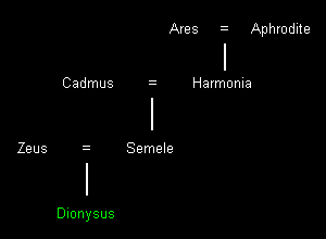 De tweede stamboom, hieronder weergegeven, toont de reïncarnatie van Zagreus: Dionysus. Hier is Dionysus of Bacchus de zoon van Zeus en de sterfelijke vrouw Semele, die later de godin Thyone zou worden.