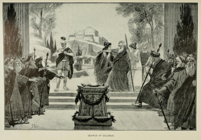 De blinde Oedipus, verbannen uit zijn geboorteland Thebe en teruggebracht tot een zwervend bestaan geleid door zijn dochter Antigone, arriveert in de stad Colonus, waar hem aanvankelijk wordt gezegd verder te gaan omdat de grond daar heilig is voor de Erinyen of Furiën (ook bekend als de Eumeniden). Oedipus beschouwt dit als een gunstig teken, omdat Apollo’s oorspronkelijke profetie, naast de voorspelling dat hij zijn vader zou doden en met zijn moeder zou trouwen, ook onthulde dat hij zou sterven op een plaats die heilig is voor de Furiën en dat hij een zegen zou zijn voor het land waarin hij begraven wordt.