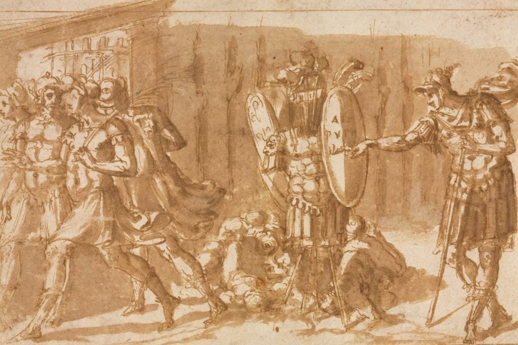 Griekse krijgers verwikkeld in een gevecht, wat de geest van de strijd vertegenwoordigt die de Makhae belichaamden